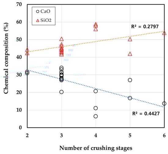 Figure 5 depicts the variation in CaO and SiO2 content in waste concrete fine powder as a function of the number of crushing stages. As the number of crushing stages increases, the CaO content decreases, while the SiO2 content increases. This trend clearly suggests that the chemical properties of waste concrete fine powder can be controlled by selecting appropriate crushing processes. Fine powder generated from fewer crushing stages—such as that from road construction aggregate production—tends to have a higher CaO content due to more effective separation of cement paste. Therefore, to effectively utilize waste concrete fine powder as a clinker raw material, it would be ideal to use fine powder from road construction aggregate production, where fewer crushing stages are applied. This powder, with its higher CaO content, can provide the necessary components for clinker production while contributing to resource conservation and reducing carbon emissions in the cement industry.