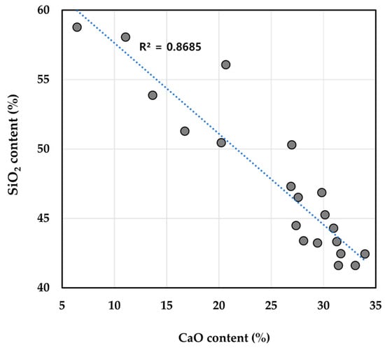 Figure 6 illustrates the relationship between the contents of CaO and SiO2, which vary significantly depending on the degree of cement paste separation in the recycled aggregate. When the cement mortar is efficiently separated from the recycled aggregate, the CaO content in the fine powder increases. Conversely, when the separation of the cement mortar is insufficient, residual SiO2 is introduced into the fine powder, resulting in a relative increase in SiO2 content and a decrease in CaO content. This phenomenon shows that changes in CaO and SiO2 content are inversely related, with the coefficient of determination (R2) calculated to be 0.8685, indicating a strong negative correlation.