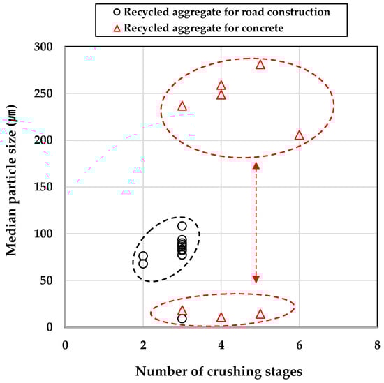 Table 4 presents the types of crushers, grinders, and the number of crushing stages at 20 concrete recycling plants in South Korea where waste concrete samples were collected. These plants were categorized based on the final product’s intended use. An analysis of the crushers, grinders, and crushing stages for each product type revealed that plants producing aggregates for road construction generally employed two or three stages of crushing, using jaw and cone crushers. In this process, large chunks of waste concrete are first crushed by a jaw crusher, followed by a cone crusher to remove cement paste from the aggregate surface.