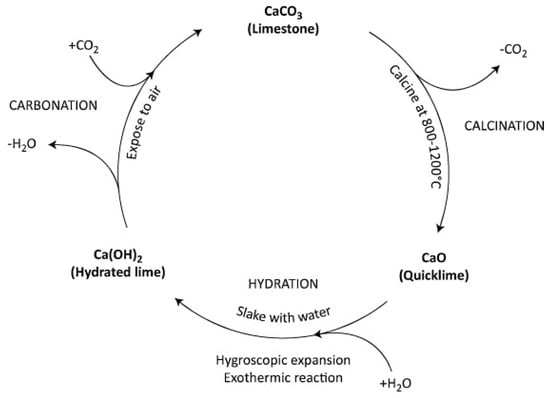 Figure 9 represents the lime cycle, a fundamental process in the production and transformation of calcium-based materials, showing the cyclical transformation between limestone (CaCO3), quicklime (CaO), and hydrated lime (Ca(OH)2) [45]. Calcium carbonate is known to decompose in the temperature range of 600–900 °C, a process that can be accurately measured using thermogravimetric analysis. Therefore, to evaluate the carbonation rate in waste concrete fine powder, the amount of calcium carbonate formed in the powder was quantified using DT-TGA.