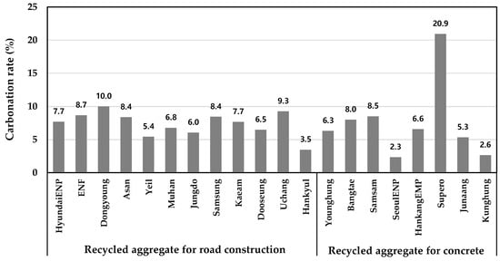 Figure 10 shows the carbonation rates of waste concrete fine powders produced in different recycled aggregate production processes. The carbonation rate of waste concrete fine powder is influenced by factors such as the materials, mix proportions, design strength, type of structure, location, and environmental conditions of the original concrete. For example, interior structures, well-waterproofed exterior structures, or concrete with high design strength tends to exhibit lower carbonation rates, whereas bridges, dams, or concrete exposed directly to the outdoors generally shows higher carbonation rates.