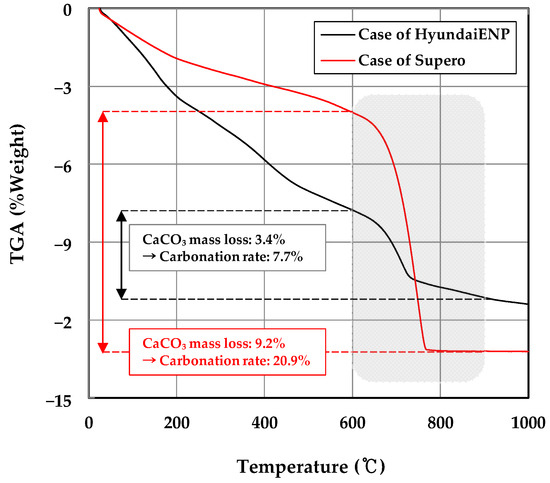 Figure 11 compares the thermogravimetric analysis data for the HyundaiENP and Supero samples. The carbonation rate for each sample was calculated based on the mass loss of calcium carbonate in the 600–900 °C range. The HyundaiENP sample showed a relatively gradual mass loss in this temperature range, resulting in a carbonation rate of 7.7%, which is close to the overall average carbonation rate (7.4%) observed in this study. In contrast, the Supero sample exhibited a much steeper mass loss in the same temperature range, leading to a carbonation rate of 20.9%. This significant difference in carbonation rates highlights the influence of environmental exposure and the characteristics of the demolished concrete structures. The results emphasize the importance of considering these factors when evaluating the carbonation potential of recycled waste concrete fine powder.