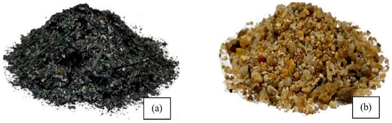 Ordinary Portland cement (OPC) with chemical composition of 63.1% CaO, 17.2% SiO2, 4.0% Al2O3, 3.1% Fe2O3, 3.9% SO3, 0.6% MgO, and 0.9% LOI (loss on ignition) and specific gravity of 3.15 was used. Natural fine aggregate (NFA) with a maximum size of 4.75 was used. Mill scale waste (MSW) originating from the rolling mill operation process was collected from a local factory (as shown in Figure 1). The MSW was washed, dried, and sieved by passing a 4.75 mm mesh. The major composition was 99.2%Fe2O3. To prevent any effect of the mortar on the free water content, NFA and MSW were used for mixing in a saturated surface-dry condition as per ASTM C128-22 [11]. The particle size distribution of fine aggregates was assessed using sieve analysis following ASTM C136-06 [12].