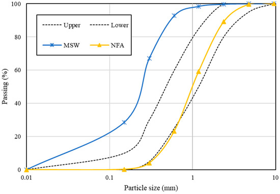 Figure 2 shows the physical attributes of the fine aggregates, while Figure 3 provides scanning electron microscope (SEM) images. Table 1 presents the physical characteristics of the fine aggregates. The specific gravity of MSW (5.52) exceeded that of NFA (2.60), but their unit weights were comparable. This similarity arose from the flat, thin, and irregular shapes of MSW (Figure 2 and Figure 3), which increased void volume and lowered its unit weight. Figure 4 illustrates the particle size distributions of the fine aggregates. It shows that NFA’s particle size distribution nearly adhered to the lower and upper limits specified by ASTM C33/C33M-11 [13]. In contrast, MSW fell outside this range due to flat–thin and irregular particles received directly from the factory without any modification.