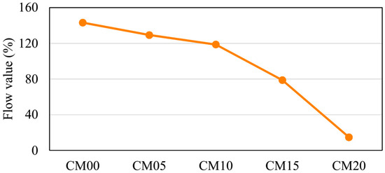 Figure 5 presents the workability of the fresh mortar mixes determined by the flow table test. As the proportion of MSW increased, the flow of fresh mortar declined, from 140% for CM00 mortar to 20% for CM20 mortar. This finding is consistent with previous research showing that replacing NFA with finer particles caused a reduction in workability [26]. As the percentage of fine particles increased, the workability decreased. In this study, the fineness modulus of the MSW was 1.1, which was lower than that of NFA (3.2), as shown in Table 1 and Figure 4. In addition, the considerable reduction in the flow value could be attributed to the flat–thin and irregularly shaped particles and the rough surface of MSW (Figure 2 and Figure 3), which negatively contributes to the ball-bearing effect and results in workability reduction [26].