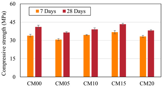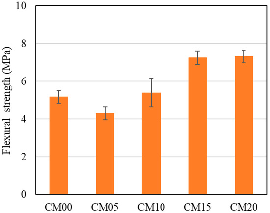 Figure 6 illustrates the compressive strength values of mortar specimens. The mortar sample containing 5–10% MSW displayed lower compressive strength compared to the plain mortar sample (CM00) due to the increase in porosity. However, it was noted that the increase in compressive strength was contingent on the substitution ratio. The highest compressive strength at 28 days was 44.1 MPa at a substitution ratio of 15% (CM15), which was higher than that of plain mortar (42.0 MPa). Figure 7 shows the flexural strength of mortar specimens that included MSW at different ratios. Observations revealed that the flexural strength varied by the MSW ratio. The flexural strength increased proportionally with the substitution ratio, ranging from 5% to 20%. Many reports [6,9,10,27] have claimed that the use of MSW as fine aggregate can improve the strength of the mortar or concrete samples. It was discovered in the current investigation that owing to the uneven structures of the MSW (as seen in Figure 3), the improvement in compressive strength of the mortar containing the MSW depended on the replacement ratio. The increase in MSW content at 15% seemed to enhance the compressive and flexural strengths, mostly because of the denser microstructure, rougher surface, and elongation of MSW particles, as well as the better interfacial transition zone (ITZ). At 28 days, the compressive strength had increased by about 5% and the flexural strength by about 40% compared with the control mortar. However, at the high MSW content (20%), the cement mixture is thought to have leaked between the irregular structures of the MSW. As a result, an immovable interlocking was created between the MSW and the cement paste. Compaction and homogeneous mixing of the slurry were inhibited by the reduction in workability. A decline in compressive strength at high MSW replacement has also been seen as the phenomenon’s consequence [28].