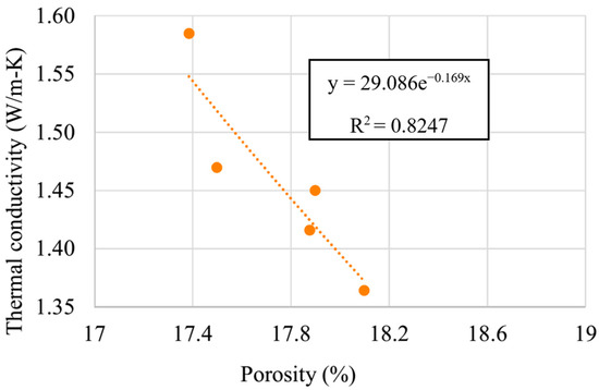 The thermal conductivity of the cement mortar ranged from 1.36 to 1.57 W/m-K. The thermal conductivity of mortar containing MSW as a fine aggregate replacement was related to the porosity. Figure 8 shows the relationship between porosity and thermal conductivity. As the porosity of cement mortar increased, the thermal conductivity values decreased. Previous reports [29,30,31,32] have also established a correlation between thermal conductivity and residual porosity. Sornlar et al. [33] indicated that the thermal conductivity was influenced by the total porosity, rather than the open and closed porosity. Furlani and Maschio [34] also demonstrated that an increase in MSW content led to a decrease in thermal conductivity compared to the reference cement mortar.