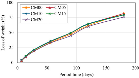 Figure 10 illustrates the percentage of weight reduction for samples subjected to sulfuric acid solution. After being exposed to 3% sulfuric acid for 28 days, every cement mortar exhibited a slight weight change. However, after being immersed for 90 days, a considerable loss in weight was observed. This phenomenon arose due to the presence of calcium hydroxide and other calcium compounds, which are byproducts of cement hydration. As demonstrated by Nuaklong et al. [37], sulfuric acid readily degrades these calcium compounds. When exposed to sulfuric acid, the cement mortar underwent a chemical reaction with the calcium hydroxide (C–H) and calcium silicate hydrate (C-S-H) compounds, leading to the formation of calcium sulfoaluminate (ettringite, AFt) and calcium sulfate (gypsum). This reaction resulted in specimen expansion, splitting, and weight loss. In this study, the rise in MSW content did not seem to impact the ability to resist corrosion. The weight loss values of all mixtures exhibited only marginal disparities, which ranged between 75% and 82% at 180 days of corrosion. Extended exposure for 180 days in 3% concentrated sulfuric acid caused significant deterioration of the samples, and a high weight loss of more than 80% was observed. These results are in line with Parvathikumar et al. [38] work, which studied the durability of concrete with MSW to partially replace fine aggregate and found that the weight loss due to sulfuric acid attack seemed to increase with MSW replacement.