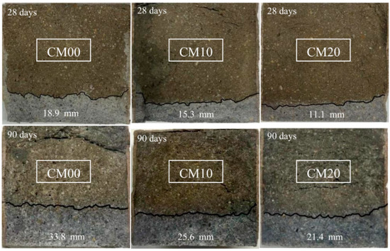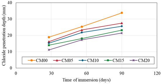 Figure 12 shows the depth of chloride penetration for periods of 28, 56, and 90 days. For the replacement of NFA by MSW in mortar, the results indicate that the resistance to chloride penetration was superior in comparison to the plain mortar. This may be due to calcium hydroxide from the hydration reaction and the presence of iron oxides in the MSW reaction to create more C-S–H gel [27]. The permeability decreased as the C-S–H gel filled the concrete pores [38]. The most effective in this experiment was achieved by substituting 20% of NFA with MSW. The chloride penetration depths of CM00 were observed to be 18.9 mm and 33.8 mm after immersing the material in a 3% NaCl solution for 28 and 90 days, respectively. CM05, CM10, CM15, and CM20 displayed 28-day chloride penetration depths of 16.2 mm, 15.3 mm, 14.0 mm, and 11.1 mm, while at 90 days, these were 27.5 mm, 25.6 mm, 23.2 mm, and 21.4 mm, respectively. Furthermore, the depth of chloride penetration in all cement mortar samples exhibited a consistent and gradual increase throughout the entire duration of the soaking period, culminating after the test. As an example, the depth of chloride penetration in CM20 was initially measured at 11.1 mm after 28 days of immersion, and it increased to 24.1 mm after 90 days of immersion.