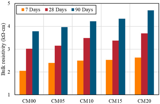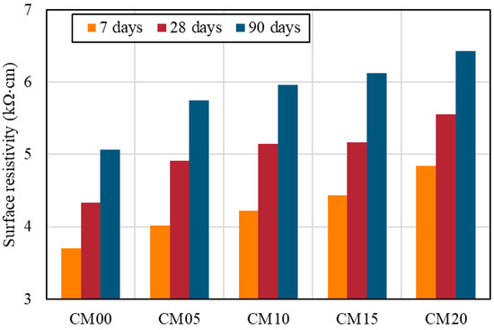 Electrical resistivity is a non-destructive testing method and can evaluate the microstructure of concrete and be utilized to predict the diffusion coefficients of chloride ions [24,39]. Figure 13 and Figure 14 illustrate that the inclusion of MSW in the mortar matrix had a significant effect on resistivity in comparison to NFA. Both the surface and bulk resistivity exhibited a nearly linear increase as the MSW content rose from 0% to 20%. For 0% MSW content mortar (CM00), the surface resistivity at 7, 28, and 90 days was 3.7, 4.33, and 5.1 kΩ·cm, which increased to 4.3, 5.2, and 5.9 kΩ·cm for 10% MSW content (CM10) or increased about 14.1%, 18.7%, and 17.5%, respectively. The 28-day surface resistivity and bulk resistivity increased from 4.3 to 5.6 kΩ·cm and 3.0 to 3.8 kΩ·cm, respectively, as the content of the MSW content increased from 0% to 20%. This showed that the addition of MSW to the cement mortar mixture enhanced its ability to resist chloride penetration and improved its electrical resistance. The results are similar to the chloride penetration depth tests described above. Ganeshprabhu et al. [27] studied the use of MSW as sand replacement in concrete production and claimed that the rough surface texture and high angularity of MSW particles increased bonding capacity with cement, thus producing very dense concrete. This may enhance chloride penetration resistance and also its mechanical properties. In addition, Chousidis et al. [6] and Parvathikumar et al. [38] also found that including MSW in the concrete mixture could improve the durability of the cementitious composites against chloride infiltration. Furthermore, the results showed that at the same condition, the surface resistivity was higher than that of bulk resistivity, which showed the same trend as other studies [24,40].