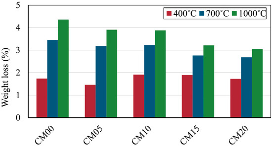The impact of increased temperatures on the weight loss of mortar is shown in Figure 16. These results indicate that when the temperature was raised, the weight loss increased. Furthermore, it can be inferred that the reduction in weight of the mortar primarily took place between the normal temperature and 700 °C. The weight of mortar after exposure ranged from about 94.5% to 98.5% of the initial weight at all temperature ranges. It has been observed that weight loss exhibits a minimal rise with rising temperature. The primary cause of this phenomenon is the process of water evaporation. The capillary and gel water constitute a significant proportion of the volume of cement paste and are expected to evaporate before reaching a temperature of 400 °C. Chemically bound water, integral to hydration products, evaporates at elevated temperatures. This evaporation contributes to the observed weight loss up to a temperature of 1000 °C [42]. At temperatures of 400 °C, the weight loss of mortar without MSW was nearly the same as that of mortar with MSW, which ranged from 1.5% to 2.0%. Ultimately, mortar with MSW exhibited a lower weight loss at the 700 to 1000 °C temperature. This was due to the increase in weight gain of MSW with temperature. Similarly, Bautista-Marín et al. [43] reported a weight change in MSW heated from 30 to 1100 °C. The results showed that the rate of weight gain increased with temperature, with the maximum gain occurring at 565 °C, indicating oxidation of Fe3O4 to Fe2O3. In summary, the weight of MSW increased after oxidization, forming Fe2O3.