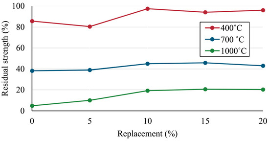 It should be noted that as the MSW content increases, the residual strength of the cement mortar rises compared to plain cement mortar. These findings conformed to those observed at temperatures of 400 °C with an MSW replacement of 10–20%. The increase in porosity and a decrease in the thermal conductivity of mortar containing MSW may reduce pore pressure and a narrower temperature gradient between the core and surface of the specimens [45]. Thus, the addition of MSW enhanced the strength of the mixtures after a fire event.