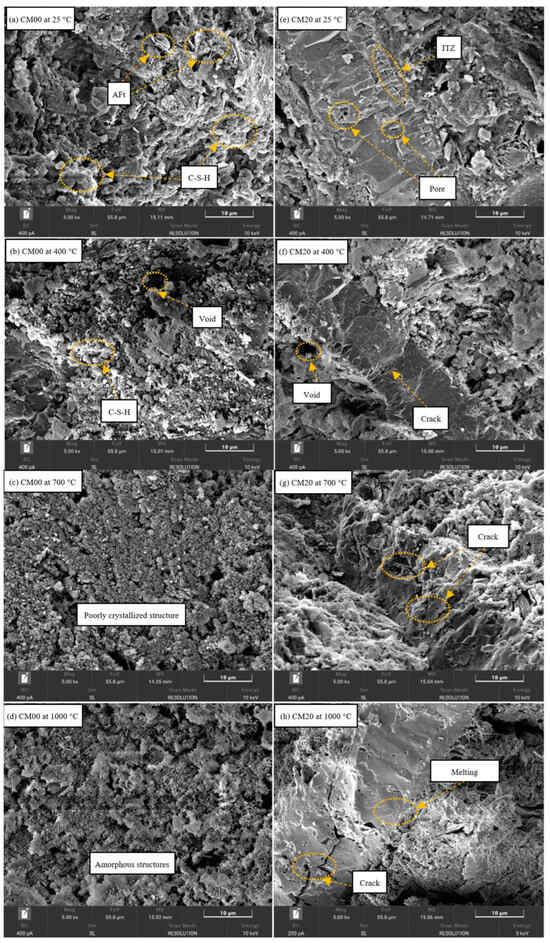 At 700 °C, the hydration product in CM00 exhibited a poorly crystallized structure (Figure 19c). The cement mortar underwent further degradation, with noticeable discoloration and fissuring on the specimens’ surface. As shown in Figure 15, cracks became increasingly evident as the temperature rose to 1000 °C [47,48]. In Figure 19g, the hydration product of CM20 shows greater density than CM00: although CM20 had larger cracks, it retained its structural integrity.