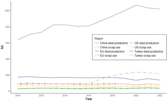 The use of scrap in steel production varies by country and depends on many factors, e.g., scrap supply (within the country and on the global market), quality requirements of the final product, and existing EAF infrastructure. Figure 1 displays the relationship between total steel production and scrap use in steel production for China, Turkey, the EU, and the US based on data from the Bureau of International Recycling (BIR) [24]. Turkey is by far the world’s biggest steel scrap importer and has the highest rate of scrap use in steelmaking, with up to 90% scrap input. China’s scrap use, on the other hand, has slowly increased from 14% in 2010 to 21% in 2022. The EU, for comparison, displays scrap use rates between 54% and 59% in the period represented, thus basing more than half of its steel production on raw materials from recycling.