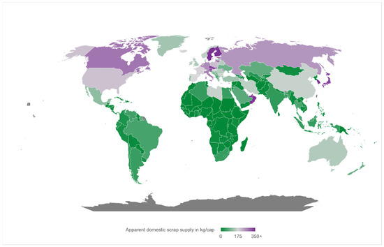 Equipped with the (estimated) scrap consumption, we use Equation (1) to compute the apparent domestic scrap supply. Globally, ADSS and CONS correspond to each other because all scrap consumed must have been supplied somewhere. The countries with the largest apparent domestic scrap supply in 2022 were China (215 Mt), India (60 Mt), and the USA (59 Mt). Dividing these values by the countries’ population yields apparent domestic scrap supply per capita, as displayed in Figure 1.