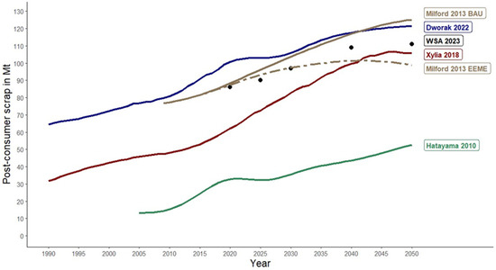Figure 3 displays the annual amount of post-consumer scrap available for recollection in megatons (Mt) between 1990 and 2050, according to the studies in our sample. We focus on 2050 as the target year for a number of EU directives and include 1990 as a starting point to facilitate a comparison with the recent past. The dashed line represents an alternative scenario in Milford et al. [35]. WorldSteel provided us with values for selected years which are represented as black dots.