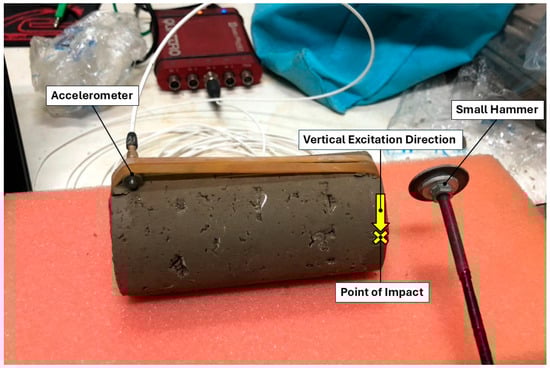 The FFR test is a simple, non-destructive and reliable laboratory test to determine the low-strain stiffness of materials []. This technique has been applied to evaluate concrete’s strength [], to investigate the strength development and control construction quality of cement-treated soils [,,,,], and to determine the stiffness of cored rock samples [,] and asphalt materials []. In this study, specimens were tested in a torsional mode to measure the shear wave velocity () after curing. The waves were generated by vertically tapping the sample with a small hammer at one end and recorded by an accelerometer attached horizontally and perpendicularly to the sample length at the other end, as illustrated in Figure 1.