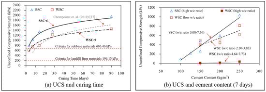 Figure 2b highlights the positive correlation between the cement content and UCS, with SSC showing a steeper strength increase than WSC. This difference is attributed to variations in the initial moisture contents and w/c ratios. At higher w/c ratios, SSC exhibits higher UCS than WSC, but their UCS values converge at lower w/c ratios due to SSC’s higher water demand during hydration. In addition, using lower w/c ratios significantly enhanced the UCS at all curing stages, consistent with previous observations. These results also align with those of studies by Chompoorat et al. [], showing that WSC exhibits strength development patterns similar to those of natural dredged sludge of comparable soil types.
