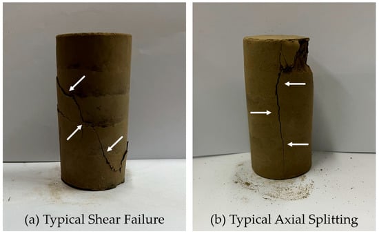 After the UCS testing, two types of fracture planes, axial splitting and shear failure, were observed. The white arrows indicate the alignment of the failure planes, as illustrated in Figure 3. For relatively high-strength samples, the fracture occurred in the form of axial splitting, similar to that observed in fracture planes of cylindrical mortar, whereas for low-strength samples, shear failure took place, similar to that observed in the failure plane of hard clay. These fracture planes were the locations where samples were collected for XRD testing, SEM, and subsequent SEM-EDX analyses.