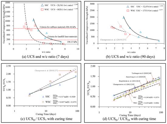 An alternative method was employed to normalize the unconfined compressive strength; it is graphically represented in Figure 4d. In this approach, the strength at 28 days of setting, denoted by UCS28, was used for the normalization process; consequently, UCSD/UCS28 was plotted as the ordinate. The rationale for selecting the 28-day strength is that it corresponds to the period when a significant portion of the cementation reaction has been completed. The comparison included various improved soils from different sources as documented by Jamsawang et al. [], Horpibulsuk et al. [], Chompoorat et al. [], and Yoobanpot et al. [], with a specific focus on the SSC and WSC in our study. While a comparable trend was observed between SSC and the materials reported by Chompoorat et al. [], it is evident that the strength development of WSC lagged behind that of the other materials. This discrepancy can be attributed to the higher w/c ratio of WSC. The relationship between the UCSD/UCS28 ratio and the setting time for SSC and WSC is expressed by Equations (6) and (7), respectively. These equations encapsulate the observed trends and provide a quantitative representation of the normalized UCS over the curing time for the soil–cement materials.