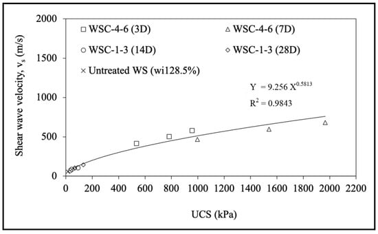Through the tests conducted using the free–free resonance (FFR) vibratory apparatus, which were non-destructive tests, the performance of the improved sediment was investigated. UCS testing was used to investigate the linear relationship between the UCS of the improved sediment and the shear wave velocity () obtained from the FFR tests. The results indicated a linear relationship, showing that as the UCS increased, the shear wave velocity also increased, indicating the stiffness of the cement-treated soil. These results are illustrated in Figure 5. The correlation between and UCS can be expressed by Equation (8).