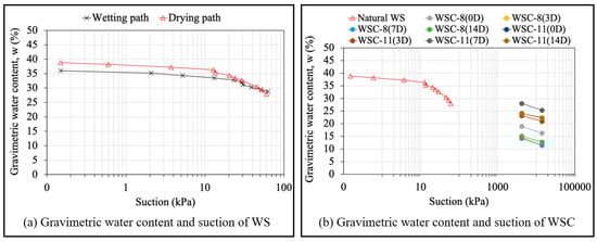 Figure 6a illustrates the relationship between matric suction and the gravimetric water content of naturally compacted soil, indicating an increase in matric suction resulting in a decrease in gravimetric water content. The air entry point of the compacted soil was observed at a matric suction of 15 kPa, corresponding to a gravimetric water content of 35% along the drying path. The isopiestic humidity control technique was used to analyze the relationship between suction and the moisture content of the cement-improved soil, as shown in Figure 6b. The results indicate that the moisture content of WSC-8 (200 kg/m3 cement content, 33% initial moisture content) was lower than that of WSC-11 (200 kg/m3 cement content, 40% initial moisture content) at the same curing age. This discrepancy is attributed to the initial moisture content of the soil prior to improvement, suggesting a denser structure in the WSC-8 soil mass, which correlates with the higher UCS obtained in previous tests.