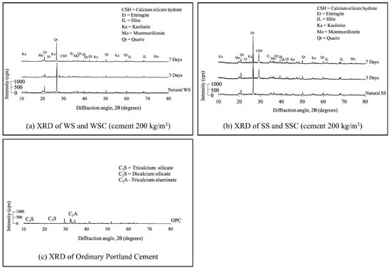 An X-ray diffraction analysis revealed that the major mineral compositions of the WS and SS samples were similar. As illustrated in Figure 7a,b, both samples contained common minerals such as quartz and various clay minerals, including illite, kaolinite, and montmorillonite. In addition, the XRD pattern in Figure 7c indicates the presence of the primary components of OPC, including C3S, C2S, and C3A. After the stabilization process, both the WSC and SSC samples showed the presence of reaction products such as calcium silicate hydrate (CSH) and ettringite, and an increase in their quantities at 3 to 7 days of curing was observed, as illustrated in Figure 7a,b. CSH phases are well known as the dominant hydration products of C3S and C2S, while ettringite is primarily formed when C3A reacts with water in the presence of gypsum [,].