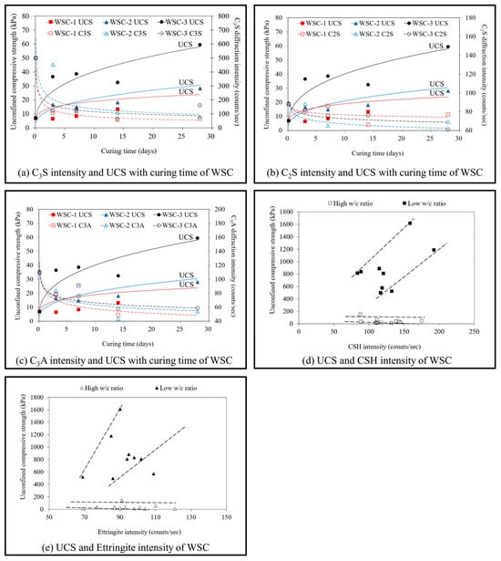 Figure 8a illustrates the relationship between the C3S diffraction intensity and UCS and the curing time of WSC. It became clear that as the curing time increased, the contents of initial cementitious compounds decreased. The reaction rates can be illustrated as two separate functions: as a linearly declining function for curing times less than two days and as an exponentially declining function for all later times. In contrast, during the short-term curing period (0 to 7 days), the UCS increased rapidly; then, it increased gradually during the intermediate to long-term curing period (7 to 28 days). Furthermore, the reaction rates of C2S and C3A exhibited inverse correlations with strength development, similar to that of C3S but in smaller quantities, as illustrated in Figure 8b,c.