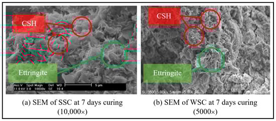 SEM microstructures of SSC and WSC at 7 days of curing.