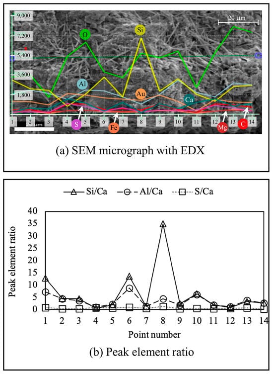 Figure 10a,b present SEM micrographs with a PER analysis of WSC-1 after 14 days along the horizontal axis. The numbers in the Figure represent the locations where PER values were analyzed. CSH and ettringite were observed embedded in and covering the soil surface. Specifically, the Si/Ca ratios, ranging from 0.58 to 4.60 at points 3–5 and from 0.89 to 6.40 at points 9–13, indicate the presence of a CSH matrix that binds soil particles, thereby contributing to increased density and structural strength.
