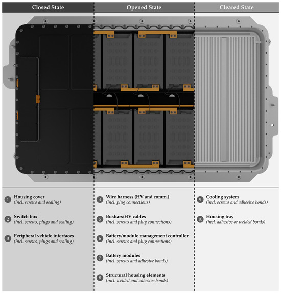 The major challenge for future automation in the field of battery dismantling is the complex product structure of battery packs along with the large number of variants on the market and the corresponding process structure for the disassembly. In general, battery systems combine functionally equivalent component groups within their underlying sub-levels [21]. For example, battery systems usually have interconnected stacks of cells. In the case of non-cell-to-pack approaches, these are interconnected to form modules, which are brought together in a housing for functional or safety reasons and are monitored with corresponding sensors and controllers [22]. A similar principle is also followed at the pack level, where the previously interconnected modules are in turn combined via busbars or high-voltage (HV) cables to be able to meet the respective capacity and performance requirements of the vehicle. In addition, there are battery management controllers, structural components and corresponding peripherals for the cooling circuit [23]. With a housing cover and corresponding interfaces to the vehicle, the battery is integrated into the vehicle design. Figure 1 illustrates the common component groups mentioned and the conditional states for battery pack disassembly.