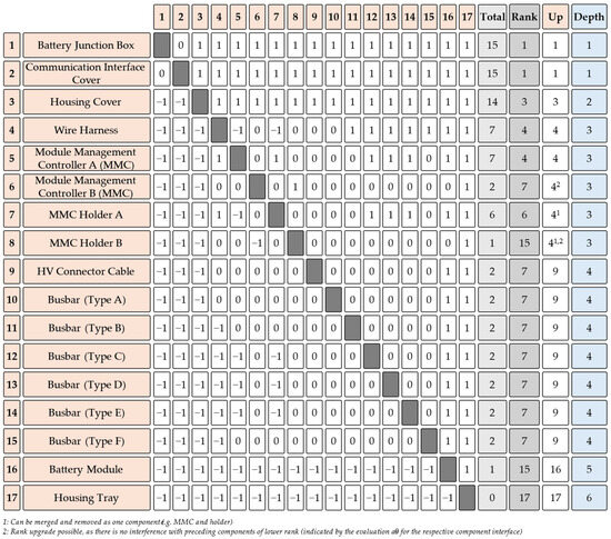 To derive the disassembly depth of the individual components of the battery system, the disassembly priority matrix approach introduced by Wegener et al. [27] was initially applied, with which the sum of the downstream components for each individual component was initially obtained using an evaluation scheme consisting of −1, 0 and 1. A classification of 0 indicates no dependencies between the two components. A value of −1 indicates that the compared component needs to be removed before the considered component. The sum of positive entries in a row results in a value that is in turn classified as a rank in the disassembly sequence. The complete disassembly priority matrix is shown in Figure 2. There are 17 different component types for the Audi e-tron battery system, whereby the busbars were divided into six separate types as they were present in different shapes. This in turn must be considered in any sensor-based vision approach in process automation. The combination of the module management controller (MMC) and holder was also found in two different configurations.