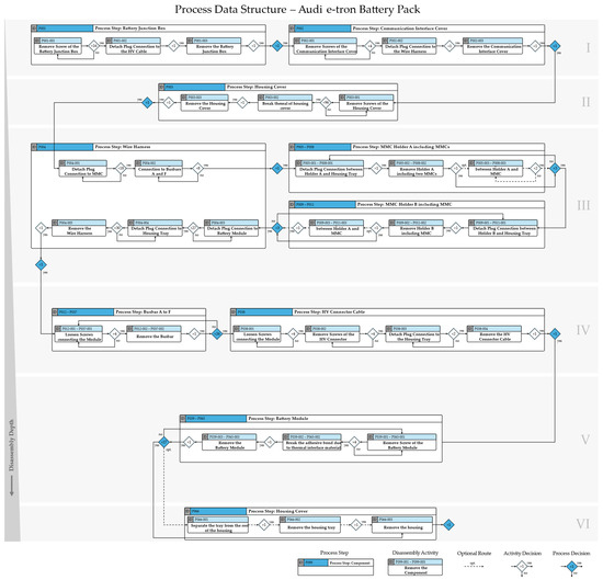 Process data structure for the disassembly of the Audi e-tron 50 battery system consisting of the sequence of process steps and their respective assigned process activities, arranged along the disassembly depth levels.