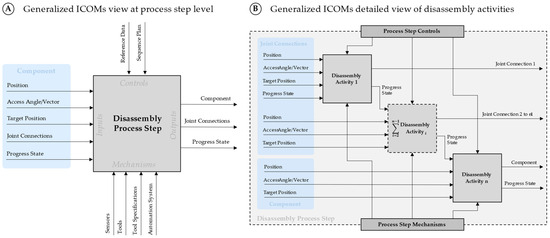 Part B of Figure 5 is structured in the same way, whereby the respective disassembly activities are executed here, each of which references the data of the joints as inputs before the component itself is removed from the product system in a final step. The progress state depends on the previous activity. The type of joint determines whether or not it will be carried out as a physical output from the activity step. Adhesive and welded joints are usually separated and then remain as part of the respective component for removal from the product system. This can also apply in part to plug connections, depending on the disassembly technology selected. Depending on the hardware and software structures within the disassembly system, the ICOMs must be expanded to include additional elements. The approach therefore serves as a generalized basis. For combined tools that process several joint connections simultaneously, the sequencing would have to be parallelized.