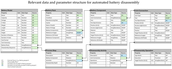 The data type designations of the respective data properties required for a software-side implementation are also part of the structure as well as a categorization of possible data sources for the implementation based on the initial consideration of the battery passport. Based on the current state of discussion for the battery passport, the data that will be provided in the prototype application of the passport are highlighted (green). There are also data that are partially available or where the level of detail could not yet be fully derived (blue) and where there are no verified data sources present (white) [53]. Some data properties can also be generated via the disassembly plant (DP) and its structure (e.g., during the process via sensors). These are mostly located at the lower hierarchical levels. At present, this means that the upcoming battery passport will not provide sufficient data for the automation of battery disassembly. The more data points listed that are integrated into the battery passport in the future, the greater the potential is for implementing automated battery disassembly for a variety of different battery pack designs. For independent use without external sources such as the battery passport, there is also the possibility of an integrated teach-in strategy for new battery models, which would require systematic recording of the data during a manual disassembly procedure.