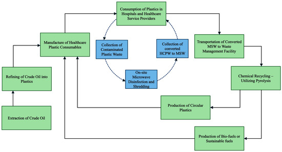 The linear “make-use-dispose” approach is prevalent in healthcare, particularly for single-use plastic consumables [11]. This linear approach, often leading to incineration or landfilling, currently dominates the healthcare industry [12], as represented in Figure 1. While healthcare experts advocate for a systemic shift towards a circular approach for consumables and plastic waste [3,13], the ineffective disposal of healthcare plastic waste (HCPW) hinders closing the material loop [14]. The large-scale consumption and the dependence on plastic consumables within the healthcare sector necessitate better management of plastic waste streams [15] and innovative and systemic solutions. Previously, different recycling technologies have been investigated for healthcare waste [16]. However, due to strict and evolving regulatory requirements [17,18], uncertainties about waste contamination, and operational challenges such as sorting and collection [19], only 9% of this waste is recycled [20,21]. Addressing these challenges requires identifying stakeholders to engage in cross-collaboration across the entire waste management system. Prior research highlights that effective recycling necessitates value chain thinking and cross-sectoral collaboration to improve waste collection, sorting, and treatment processes within a circular economy framework [22,23]. In this regard, the prior literature [23,24] emphasizes cross-sectoral collaboration and industrial partnerships among multiple stakeholders for creating a feasible solution for HCPW. To further their research, this paper examines Sweden’s current healthcare waste management practices, including regulations, hospital routines, disinfection processes, and recycling methods. Based on findings from the literature and interviews with key stakeholders, a circular solution for HCPW is identified. The study proposes utilizing on-site microwave disinfection techniques to convert HCPW into municipal solid waste (MSW), which can then be used as a feedstock for chemical recycling. Furthermore, the paper provides a collaboration and value capture matrix for different stakeholders including hospitals and healthcare service providers (HSP), on-site disinfection machine manufacturers, waste management companies, and chemical recycling companies.