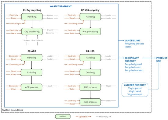 | C4—Heating Air classification System (HAS) | Main steps: crushing, ADR unit, HAS unit (burner, cyclone sluice, compressor) Products: coarse aggregates, sand and cement (structural concrete) | [3,4,11,12] |