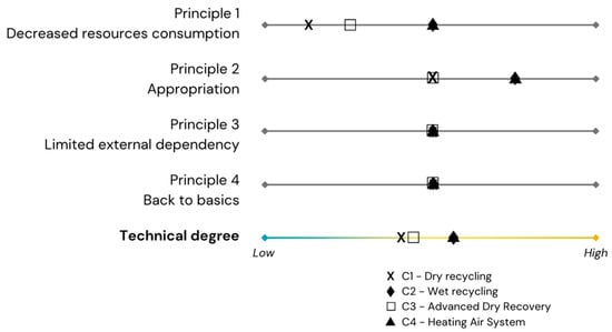 - Appropriation: Although it seemed more social than technical, the Appropriation principle included the technical simplicity criterion, which was relevant for the technical degree assessment. This criterion was assessed using two indicators: the number of steps in the recycling process and the type of equipment (fixed or mobile);