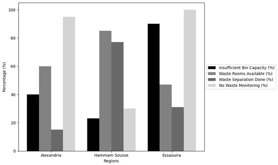 Waste management practices in selected hotels of the pilot regions have been assessed through field visits. In Alexandria, 20 hotels from 2-star to 5-star have been analysed, which have an average number of 132 rooms per hotel. In Essaouira, 19 hotels and riads (from small apartment hotels to 5-star hotels) were assessed, with an average capacity of 71 rooms per hotel or riad. In Hammam Sousse, 13 hotels (3- to 5-star) were assessed, with an average of 361 rooms per hotel. Exemplary numbers of the assessment, showing the lack of waste management infrastructure, are summarized in Figure 2.