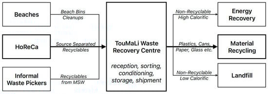 At the core of the TouMaLi pilot project is a waste recovery centre, managed by a newly established company with shared ownership between the municipality, a local waste management company, and the tourism sector (e.g., tourism associations). Figure 4 illustrates the waste flows of the TouMaLi Waste Recovery Centre. The technical approach emphasizes improved waste segregation at the source to increase recycling rates and overall waste management efficiency. To facilitate this, hotels are provided with bins for five distinct waste streams: