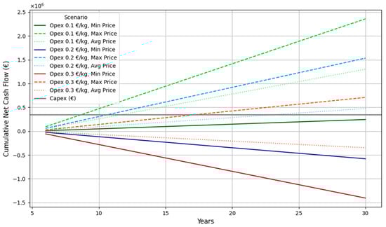 In the assumed scenario, there would be no amortization of the Capex without an additional external contribution, raising the question of how high the external funding via an EPR fee would have to be in order to achieve amortization of the Capex over periods of 5, 10, and 15 years. Based on the formulas described in the Methods and Materials section, the additional funding via an EPR contribution would have to be at: