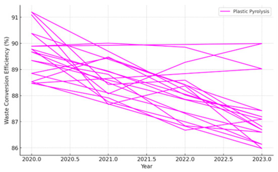 Data-driven sources claim that pyrolysis can achieve a high waste conversion efficiency that fluctuates between 70 and 90%. These fluctuations are dependent on the conditions of the process and the composition of the waste. This study emphasizes pyrolysis’ ability to convert mixed plastic waste into by-products of high value (syngas, pyrolytic oil and char) [15]. These by-products are then further refined into fuels or used in the industry, making it a promising technology for energy recovery.