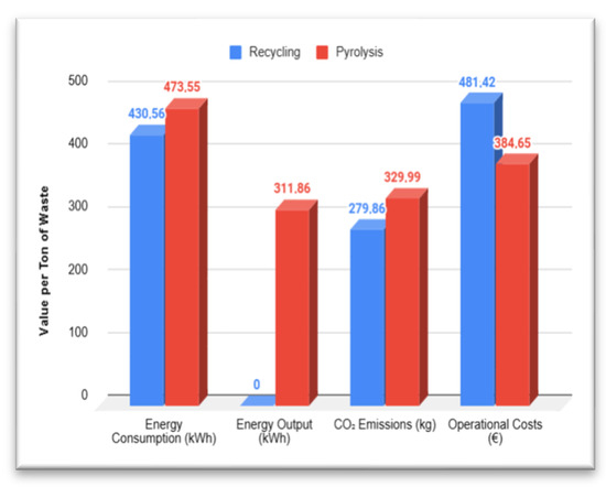 On the logistics side, pyrolysis centralized facilities can lead to increased transportational emissions and costs when recycling is dependent on decentralized networks that reduce them [12]. With that being said, recycling has better energy-intensive sorting and cleaning processes, which may circumvent some environmental benefits [15].