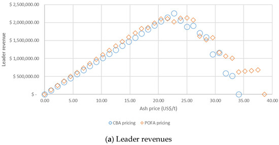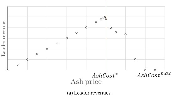 Figure 3 illustrates the behavior of the leader revenues and the quantity purchased by the follower for different prices of the biomass ash, which supports the simple grid search used to find the price ( that maximizes the revenues of the ash producers. The total revenue of the leader () can be defined as the product of the total quantity of biomass ash sold to the cement/concrete producer multiplied by the price (. The leader wants to maximize this value subject to the optimal reaction of the follower.