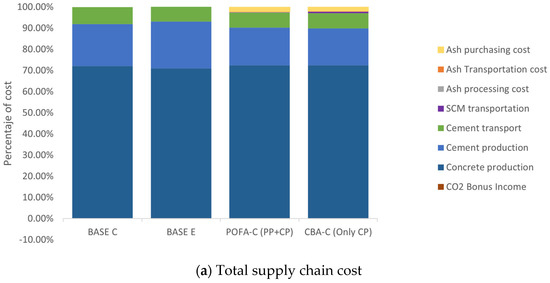 Surprisingly, the changes in the use of SCMs and the number of processing plants do not have a significant impact on the total cost of the supply chain, as shown in Figure 7. For both SCMs, the total supply chain cost remained close to the baseline scenario, with negligible savings of −0.11% for CBA and −0.04% for POFA, but never resulting in an additional cost. Moreover, recalling the logic behind Algorithm 1, if the use of SCMs is not economically viable, the supply chain will produce all the concrete using OPC. However, this is not the case, as residual production of SCM-based concrete remains feasible (9% for CBA and 6% for POFA). Under these extreme conditions, where transportation costs increased threefold, the supply chain sources biomass ash from locations close to a few concrete plants, using a single processing plant for this purpose obtaining emissions reductions near −1.3%.