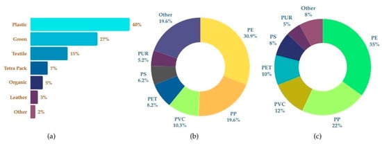 Representation of composition of waste: (a) different waste in municipal waste; (b) domestic bifurcation of plastic waste; and (c) industrial bifurcation of plastic waste [22,23].
