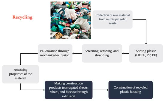 Chemical recycling is a more energy-efficient process capable of expanding recycling capabilities to previously non-recyclable polymers. Chemical recycling involves the destruction of plastics to their molecular levels and then making other forms of polymeric material or virgin material [13]. This also suggests that the pyrolysis process, which converts plastic waste into fuel products, could be a viable solution to the plastic waste crisis [14]. This method does not make the products required for construction, it just removes impurities or converts the polymers to its basic plastic. However, further research is needed to improve the efficiency and scalability of these processes. Actionable points for technological advancement, stakeholder collaboration, and policy interventions are in discussion in different research for these issues [15].