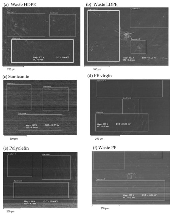 The SEM analysis of raw waste plastic materials (Figure 4) was done, and waste HDPE plastic at a magnification of 250 µm revealed compositional variations in different regions. The spectrums were further analyzed for the composition of the material. Spectrum 2 in Figure 5 indicates the presence of impurities, with a composition of 93.3 wt.% carbon (C), 5.5 wt.% oxygen (O), 1.2 wt.% calcium (Ca), and 0.2 wt.% sodium (Na). In contrast, Spectrum 4 in Figure 5 showed a slightly different impurity profile, with 95 wt.% carbon (C), a significantly higher oxygen content at 33.6 wt.%, 0.9 wt.% calcium (Ca), and 0.4 wt.% chlorine (Cl). These differences suggest localized variations in the chemical composition, potentially due to surface contamination, additives, or environmental exposure. The SEM in Figure 4 shows the details of waste LDPE plastic at a magnification of 100 µm, which revealed notable differences in chemical composition across regions. Spectrum 7 exhibited a diverse impurity profile, with 80.6 wt.% carbon (C), 13.6 wt.% oxygen (O), 4.4 wt.% calcium (Ca), 0.6 wt.% silicon (Si), 0.4 wt.% sodium (Na), 0.3 wt.% aluminum (Al), and 0.2 wt.% magnesium (Mg). However, in contrast, Spectrum 10 exhibited a pure composition of 100 wt.% carbon (C), with no detectable impurities or additives present. These results point to the surface chemistry of the LDPE sample being heterogeneous, due to contamination, additives, or processing conditions. At a magnification of 500 µm, the SEM image in Figure 4 of samicanite showed a consistent chemical composition across different regions. Both Spectrum 2 and Spectrum 3 in Figure 5 were composed entirely of 100 wt.% carbon (C), with no detectable impurities or additives present. This uniformity of the carbon structure is expected from a highly pure material with consistent processing, which is the case with samicanite.