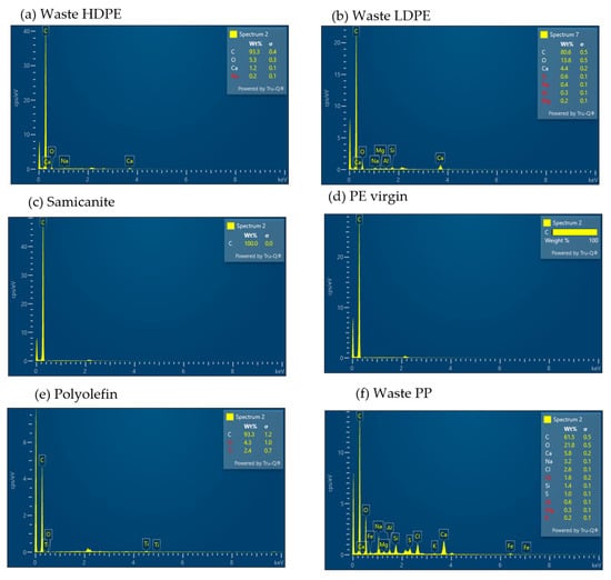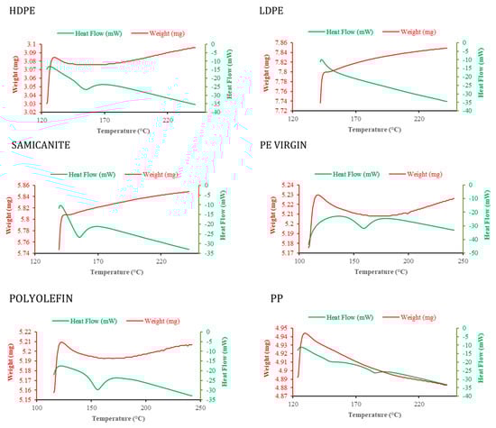 The broader heat flow peak and higher weight loss reflect LDPE’s lower crystallinity and thermal stability compared to HDPE, corroborating its susceptibility to degradation at lower temperatures [22]. For samicanite, the maximum weight was 5.84 mg at 242.06 °C, and the minimum weight was 5.74 mg at 139.07 °C, with a weight loss of 0.10 mg. The maximum heat flow was −10.45 mW at 140.40 °C, and the minimum was −32.78 mW at 242.23 °C. The multi-step weight loss and distinct thermal transitions align with the composite nature of samicanite, suggesting degradation pathways involving volatiles and matrix breakdown, as discussed in research [2]. For virgin polyethylene, the maximum weight was 5.23 mg at 117.35 °C, and the minimum was 5.17 mg at 108.34 °C, with a weight loss of 0.054 mg. The maximum heat flow was −22.855 mW at 135.683 °C, and the minimum was −43.523 mW at 108.340 °C. The small weight loss and sharp thermal transitions indicate a high purity and consistent material performance, like HDPE [44]. For polyolefin, the maximum weight was 5.209 mg at 123.088 °C, and the minimum was 5.158 mg at 115.480 °C, with a weight loss of 0.052 mg. The maximum heat flow calculated was −7.490 mW at 121.685 °C, and the minimum was −32.947 mW at 242.158 °C. The moderate weight loss and multiple heat flow peaks highlight the blended nature of polyolefin, showing overlapping thermal events. For waste PP, the maximum weight was 3.896 mg at 242.075 °C, and the minimum was 3.805 mg at 138.100 °C, with a weight loss of 0.091 mg. The maximum heat flow was −11.235 mW at 158.360 °C, and the minimum was −36.700 mW at 242.215 °C. The minimal weight loss and sharp melting peak around 160–170 °C indicate high crystallinity and excellent thermal stability, confirming its suitability for high-temperature environments.