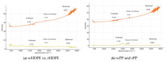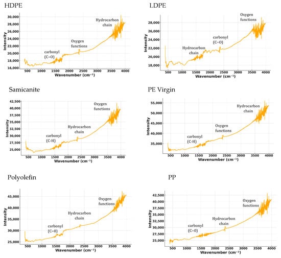 This method is both qualitative and quantitative and can be used to determine the composition of the sample, as well as the amount present [100]. FTIR was performed on all the plastic raw material samples in Figure 6. The waste HPDE has intense C–H stretching bands, together with well-defined peaks in the carbonyl (C=O) region at about 1700 cm−1, indicating that stabilizers or fillers have been used. The fingerprint region has several absorptions, which may be due to the material’s composition or its processing. This sample is most suitable for use in structural or packaging applications where the material needs to withstand the weather. The FTIR spectrum of the LDPE is characterized by the absorptions due to the hydrocarbon chain in the 2800–3000 cm−1 range. Other peaks in the 1000–1200 cm−1 region indicate the presence of oxygen-containing functions, which might be ethers or esters and are used to enhance the impact strength or service temperature of the material. This sample has easily reproducible intensity patterns that indicate that the material is homogeneous. The FTIR spectrum of samicanite shows aliphatic absorptions and a secondary peak at about 1600 cm−1, which may indicate the presence of aromatic structure or aromatics. The fingerprint region has strong and narrow peaks, which is characteristic of a good blend of polymer. This material has been developed to enhance its strength and heat resistance. Strong absorption in the carbonyl region at about 1700 cm−1 and C–H stretching peaks and a broad absorption indicate the presence of carbonyl-containing groups in the virgin PE. The fingerprint region of this polymer shows that it is a well-ordered matrix with sharp peaks. This material is probably being used in applications where chemical and environmental resistance is of considerable importance. The spectrum for polyolefin highlights strong peaks in the aliphatic C-H stretching region. Moderate absorption in the 1100–1200 cm−1 range hints at oxygen-containing additives, such as fillers or processing agents. The material exhibits consistent intensity patterns, making it suitable for lightweight and flexible applications. The waste PP spectrum reveals strong hydrocarbon absorptions in the 2800–3000 cm⁻1 region and prominent peaks in the carbonyl region, suggesting the presence of esters or ketones. The fingerprint region is rich in detail, reflecting a highly tailored polymer composition. This material appears to be designed for specialized applications where chemical resistance and structural integrity are paramount.